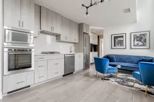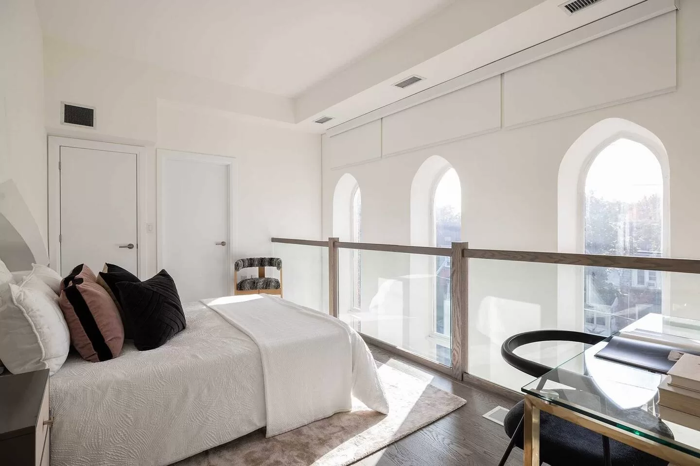 On the upper level is the loft-style living room + den, with a glass railing to overlook the impressive three lancet windows and second-level furnishings. On the 2nd level, you will find the primary bedroom, a coffee and bar area, full bathroom, and an open concept kitchen with waterfall island and an additional sitting/living area. Make your way down to the ground level and you’ll find a welcoming entry with discrete laundry and ample space for inside/outside wear. This property is just steps away from some of Toronto’s best restaurants, shops, and fitness centers!